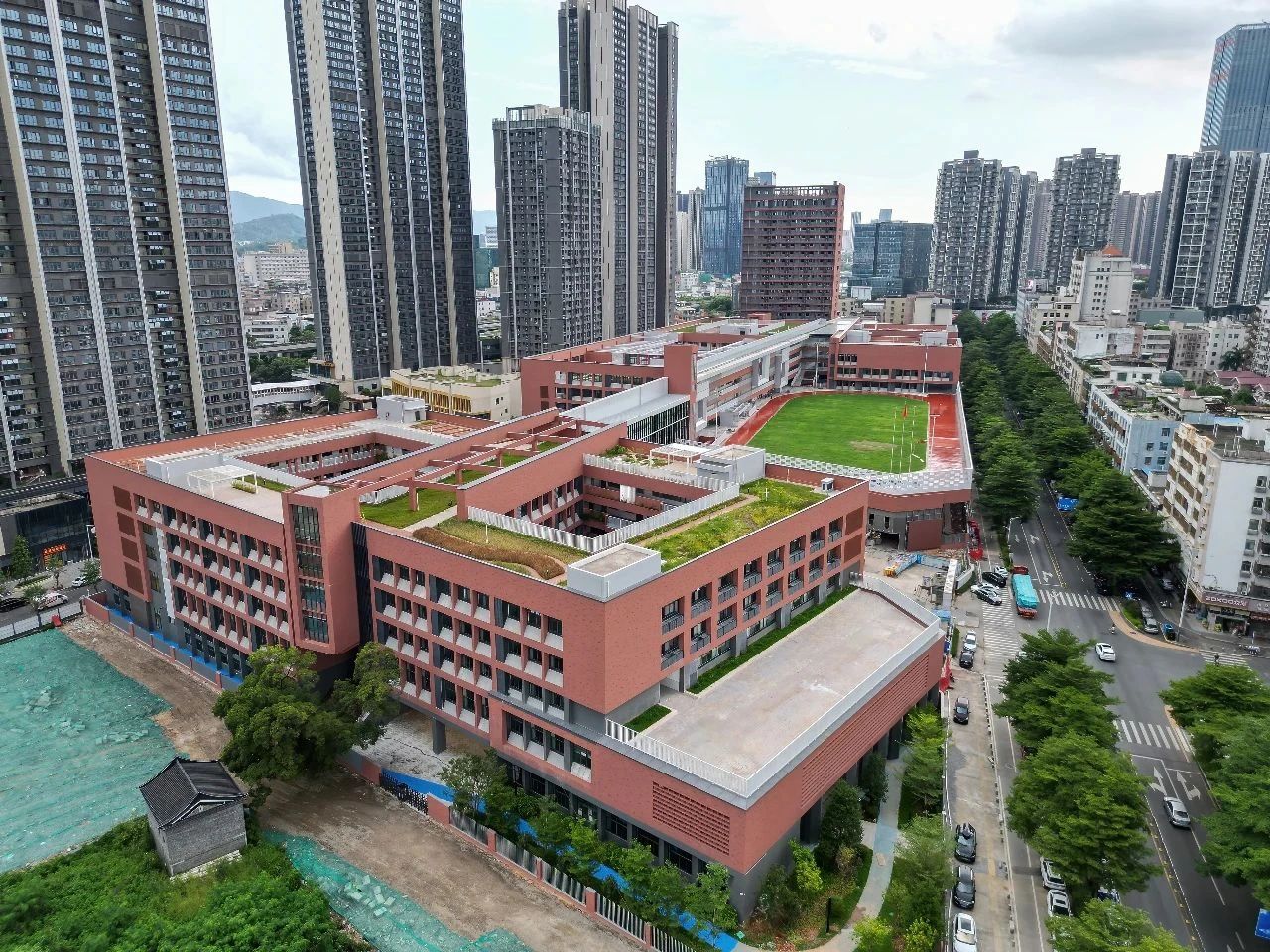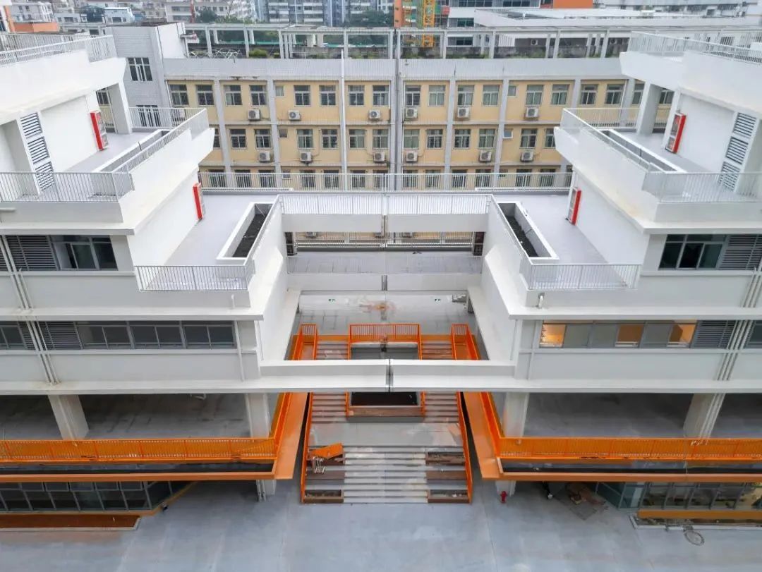 設計亮點:在深圳高密度城市背景下采用垂直校園建設,以“客家圍屋”格局形成北側為“知識”自然書院、南側為“運動”活力場院的南北兩進院落;校園通過擴建增加東側展示架,西側打造屋面活動平臺,北側布置新建教學樓,底部架空中心庭院穿插于建筑內部,不同標高退臺與屋面構成空中垂直綠化空間、新老建筑之間設計的綜合體系。