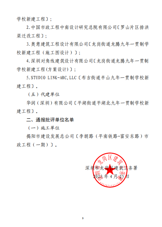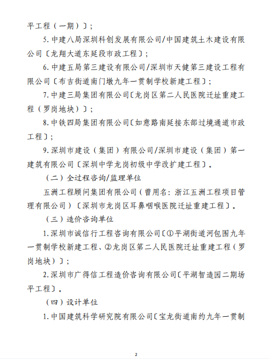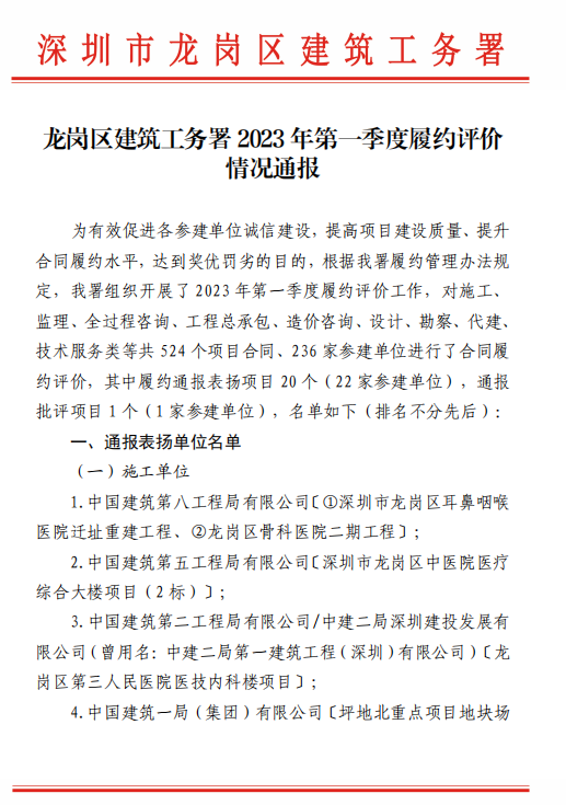 深圳市龍崗區建筑工務署在此次表揚名單中,分別對施工單位、全過程咨詢/監理單位、造價咨詢單位、設計單位、代理單位等有關技術單位提供的統籌協調、技術指導、督導調研等工作支持提出表揚。