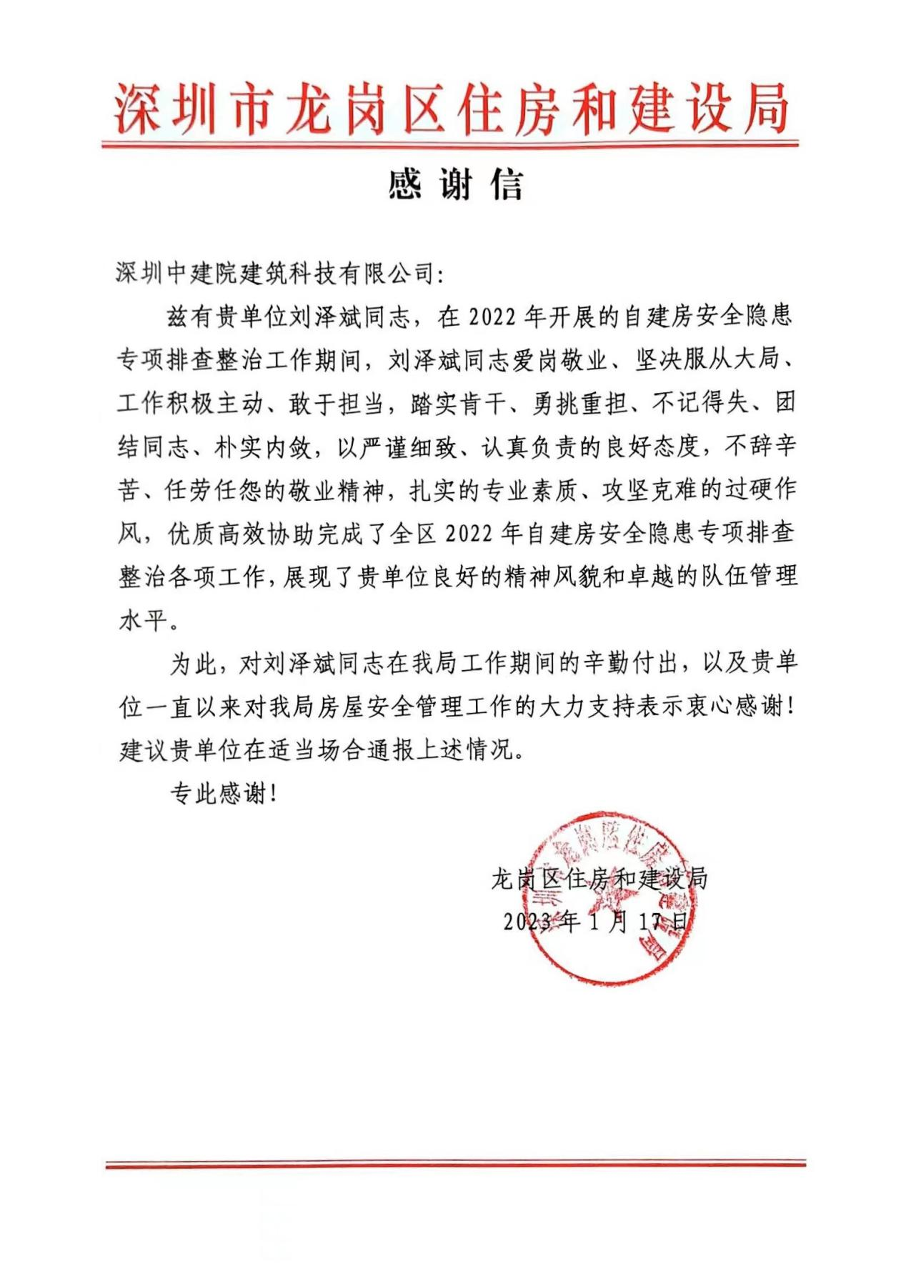 近期,深圳中建院建筑科技有限公司(以下簡稱“深圳中建院”)收到深圳市龍崗區住房和建設局發來的感謝信,對深圳中建院及劉澤斌同志在2022年度開展的自建房安全隱患專項排查整治工作中的辛勤付出和大力支持表示誠摯的謝意。