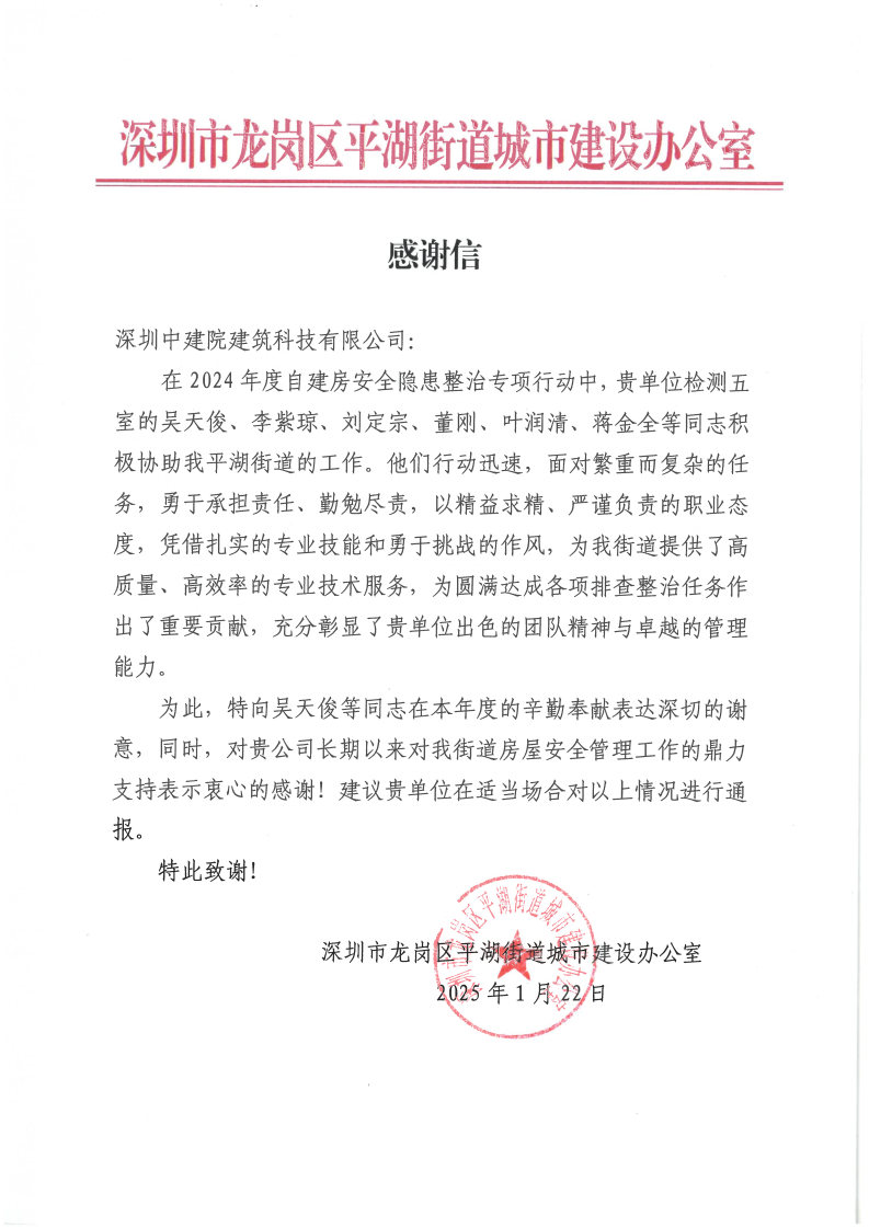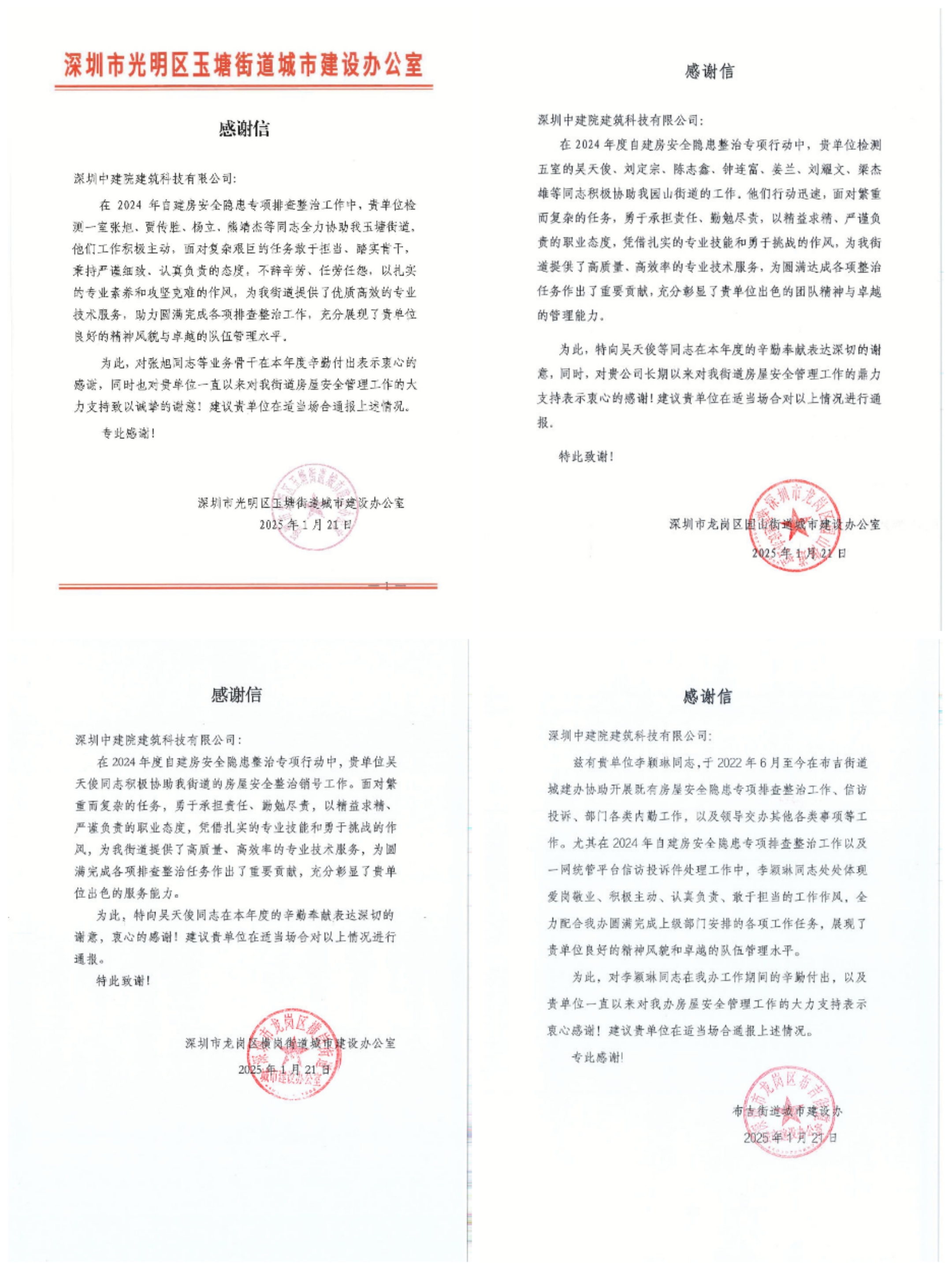 ?近日,中國(guó)建研院深圳分公司所屬深圳中建院陸續(xù)收到多封沉甸甸的感謝信——來(lái)自住房城鄉(xiāng)建設(shè)部工程質(zhì)量安全監(jiān)管司、建筑市場(chǎng)監(jiān)督司,深圳市光明區(qū)住房和建設(shè)局、龍崗區(qū)住房和建設(shè)局,及玉塘街道、園山街道、橫崗街道、布吉街道、平湖街道、新橋街道等政府部門(mén)。信中向深圳中建院在2024年建筑市場(chǎng)監(jiān)督執(zhí)法房屋市政工程質(zhì)量安全、住建行業(yè)災(zāi)害基礎(chǔ)數(shù)據(jù)庫(kù)建設(shè)監(jiān)督檢查工作中所作出的貢獻(xiàn),以及多年來(lái)對(duì)深圳市區(qū)住建部門(mén)、街道等轄區(qū)主管部門(mén)在房屋安全管理工作的默默付出表示感謝。