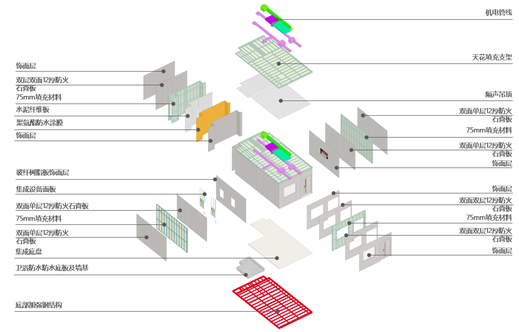 ?深圳市人民醫(yī)院寶安醫(yī)院感染性疾病防治中心結(jié)構(gòu)主體采用鋼結(jié)構(gòu),內(nèi)部采用嵌入式MiC(Modular Integrated Construction)模塊化病房及MiMEP(Module-based MiMEP)裝配式機(jī)電模塊集成建造技術(shù)。項目共采用101個模塊化病房,整體裝配率達(dá)80%以上,《建筑工業(yè)化評價標(biāo)準(zhǔn)》試評價等級為AA級裝配式建筑。項目將成為國內(nèi)首個永久性嵌入式MiC模塊化感染性防治病房,同時也是國內(nèi)首個“模塊化負(fù)壓感染防治病房”,為“模塊化機(jī)電+模塊化建筑”的集成建造方式提供了參考示范。