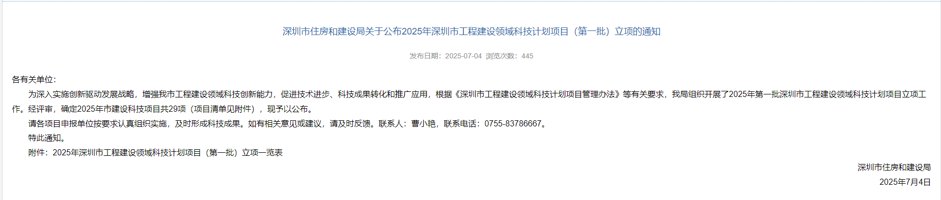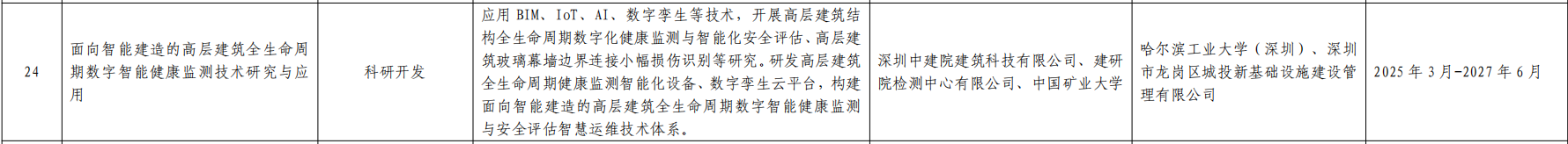 ?由公司牽頭申報的科技項目《面向智能建造的高層建筑全生命周期數字智能健康監測技術研究與應用》,成功通過2025年深圳市工程建設領域科技計劃項目(第一批)評審并獲批立項。