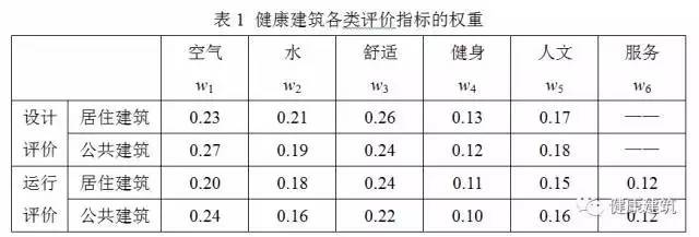 3.2.7條規(guī)定了《標(biāo)準(zhǔn)》中各評價指標(biāo)的權(quán)重。《標(biāo)準(zhǔn)》在各指標(biāo)權(quán)重研究中,以“抓主因、顧次因”的原則充分考慮了不同類型的民用建筑的健康影響因素,并按照民用建筑的分類,建立了居住建筑和公共建筑指標(biāo)權(quán)重的調(diào)研問卷,采用問卷調(diào)查、層次分析、專家咨詢、項目試評等多途徑結(jié)合的方式,建立了健康建筑各類評價指標(biāo)的權(quán)重,見表1
